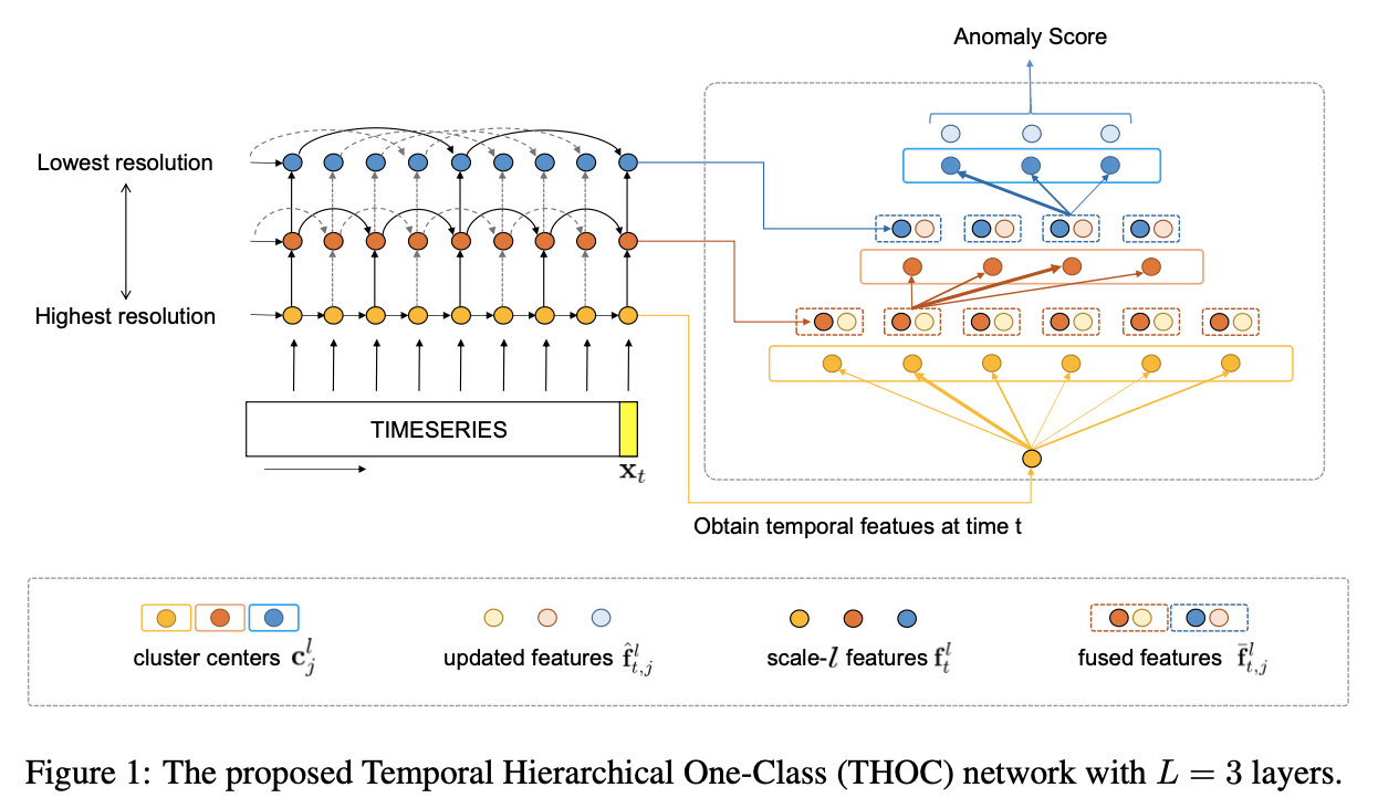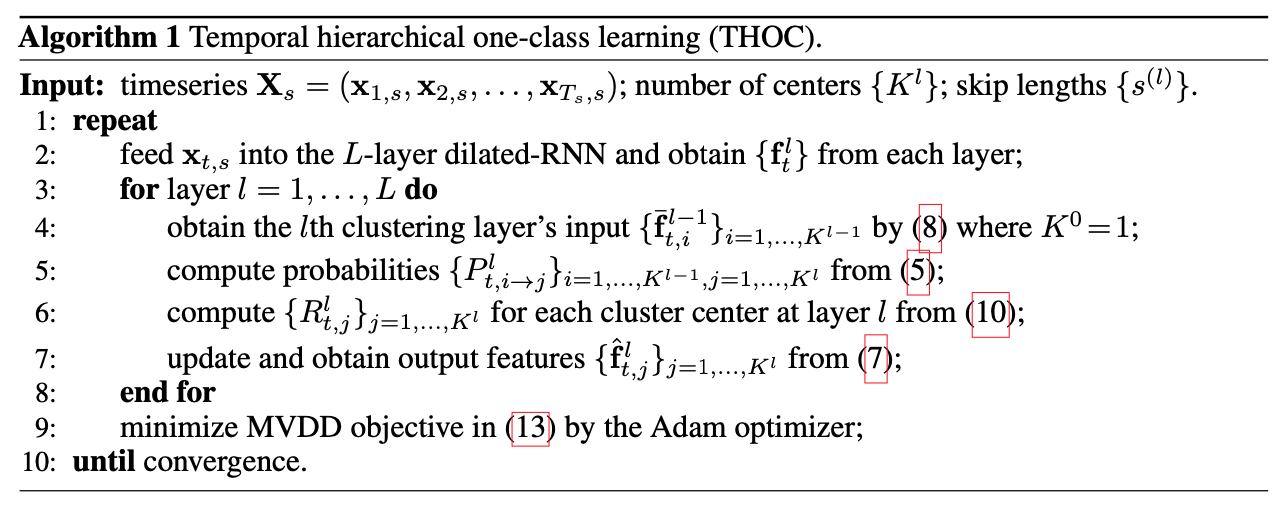 - 다음으로, THOC는 모든 layer의 feature들을 fuse 한다. 각 resolution에서의 정상 데이터는 multiple hypersphere들로 표현된다. Multiscale support vector data description (MVDD)를 사용하여 end-to-end 훈련을 진행한다.